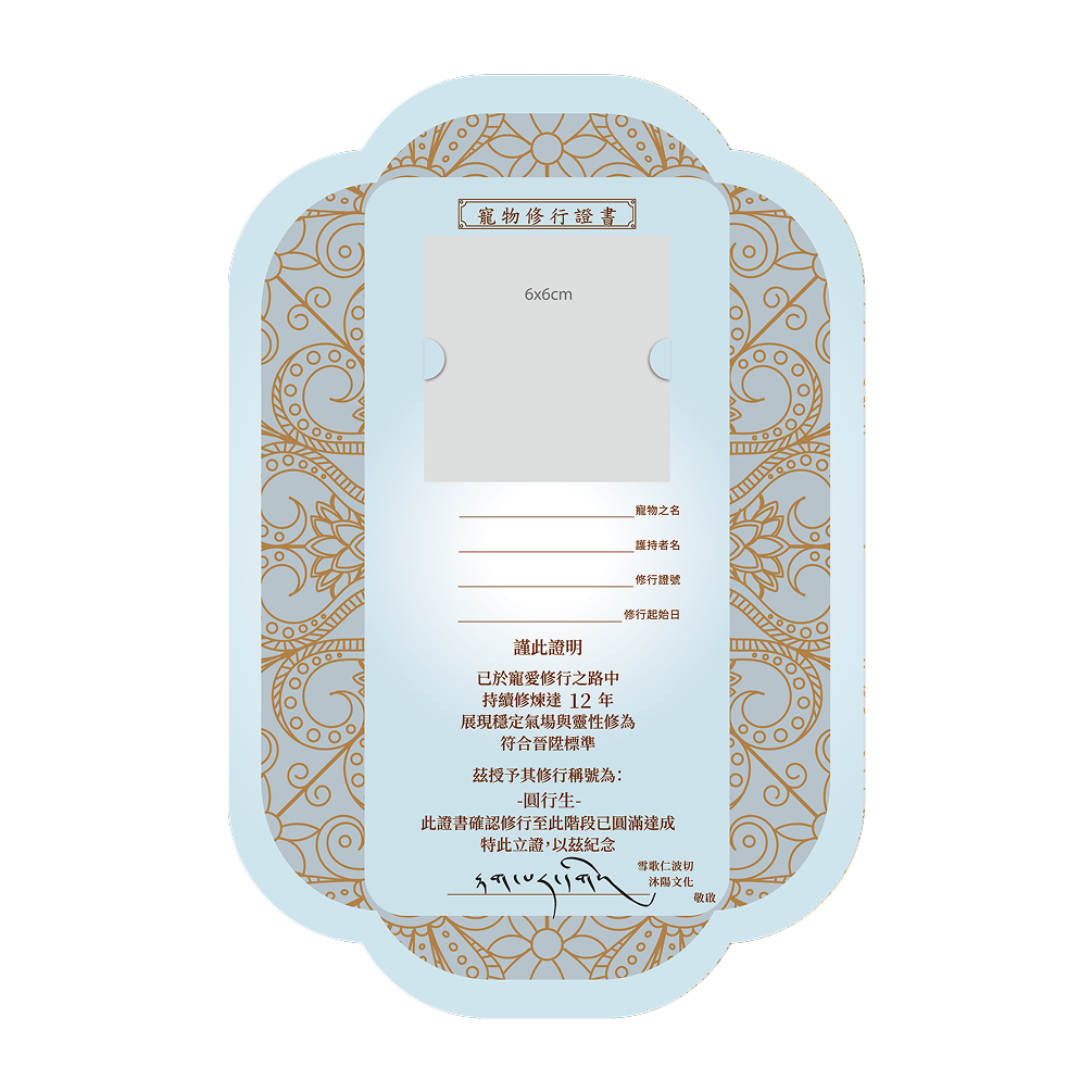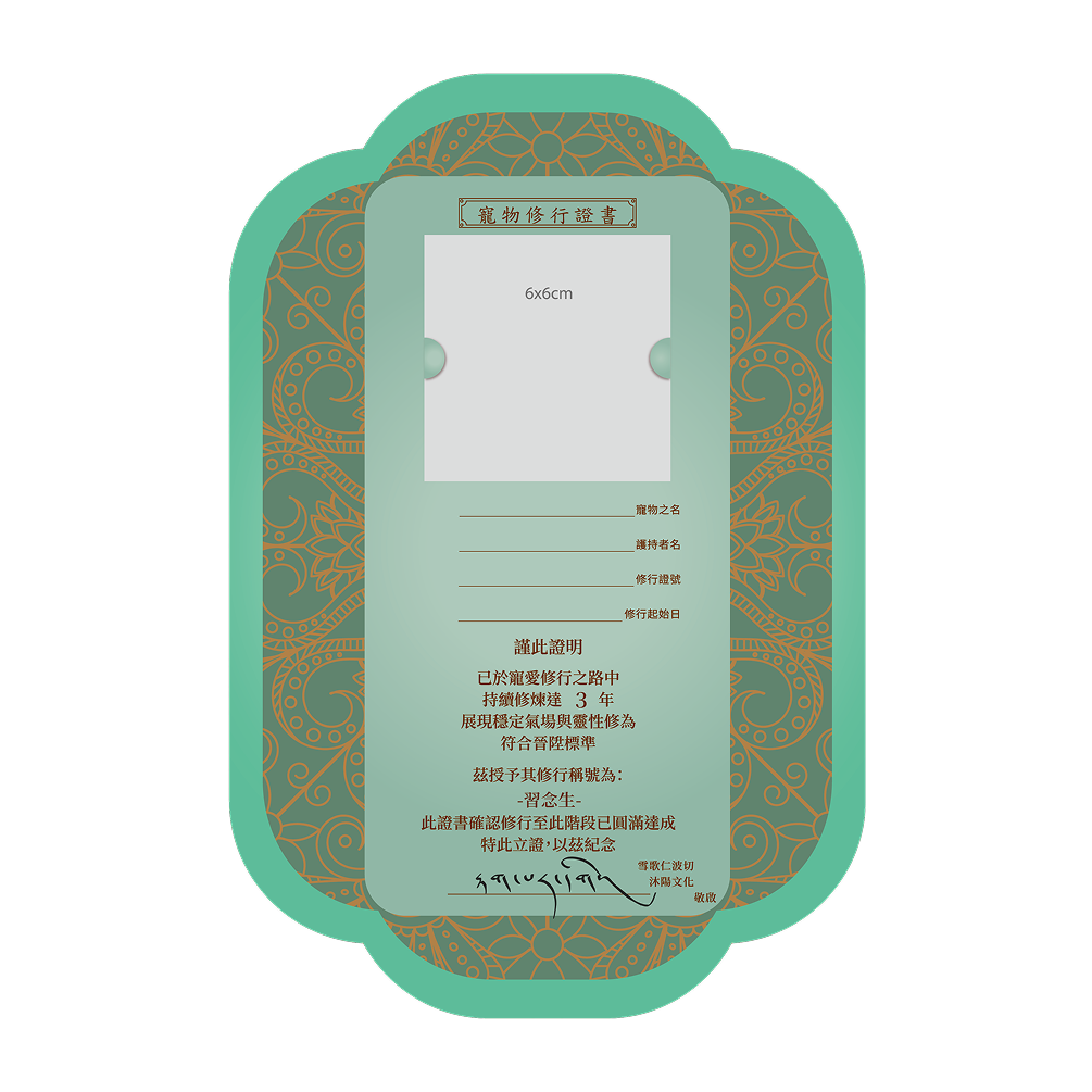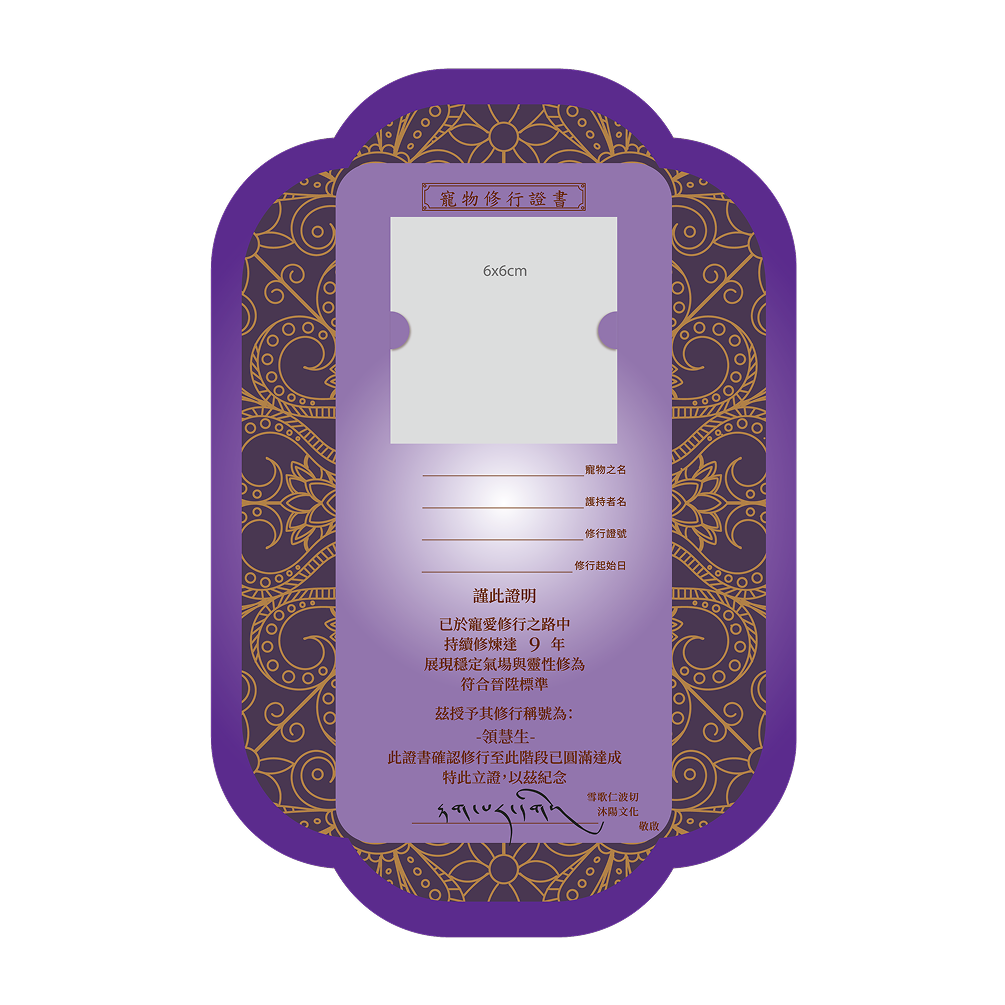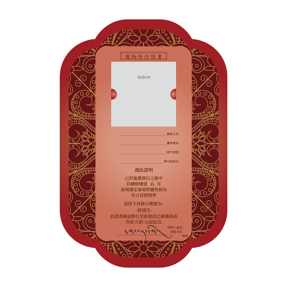 寵物修行累積滿每3、6、9、12年提供升級證書。每年依照飼主為寵物修行累積的年資,寵物可獲頒相對應修行稱號,象徵靈性與福德的進展。(晉升需符合各年限規範)